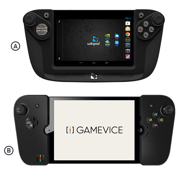 Gamevice’s Wikipad (A) and detachable controllers for mobile devices (B) as pictured in a previous lawsuit.
